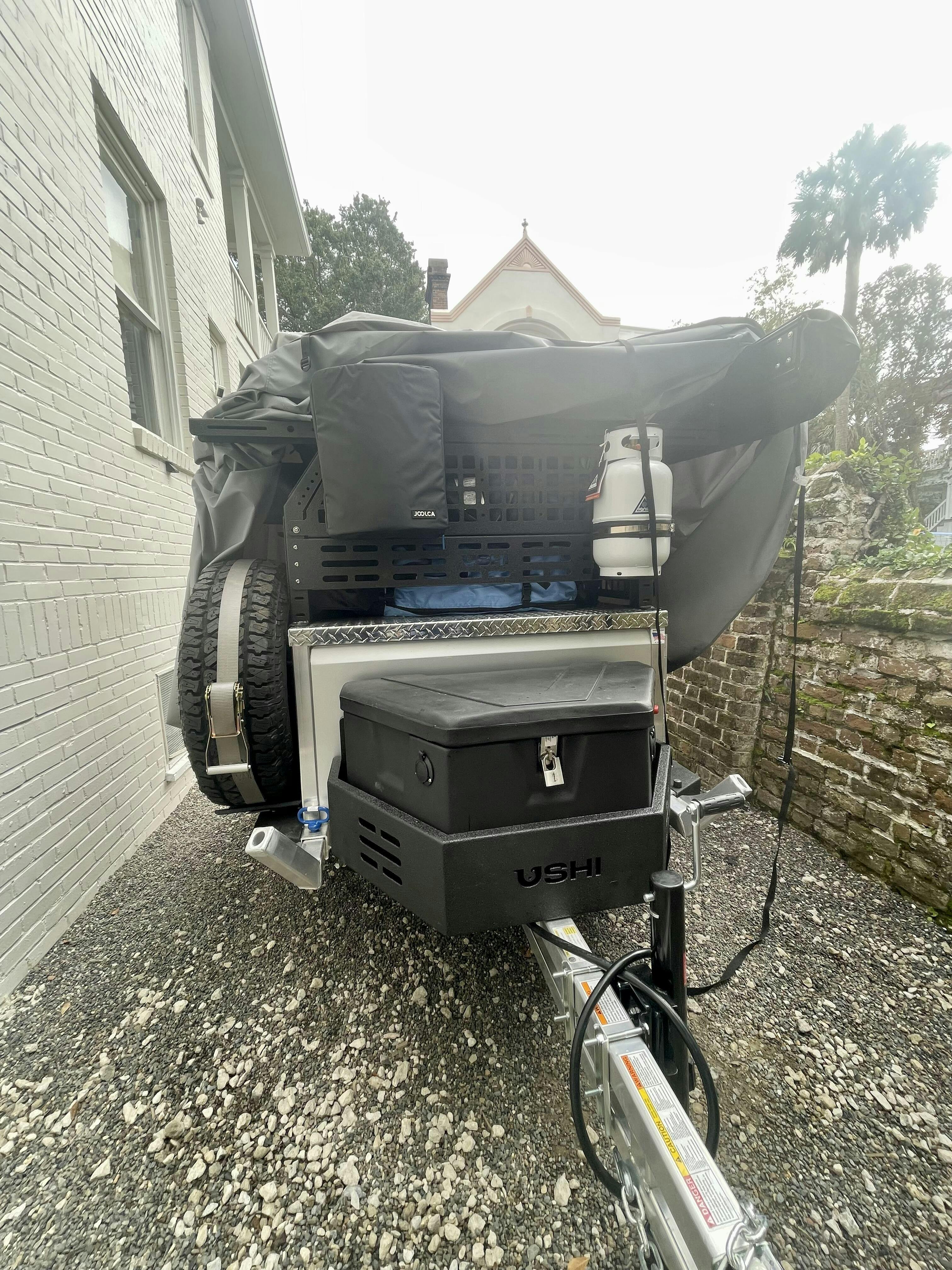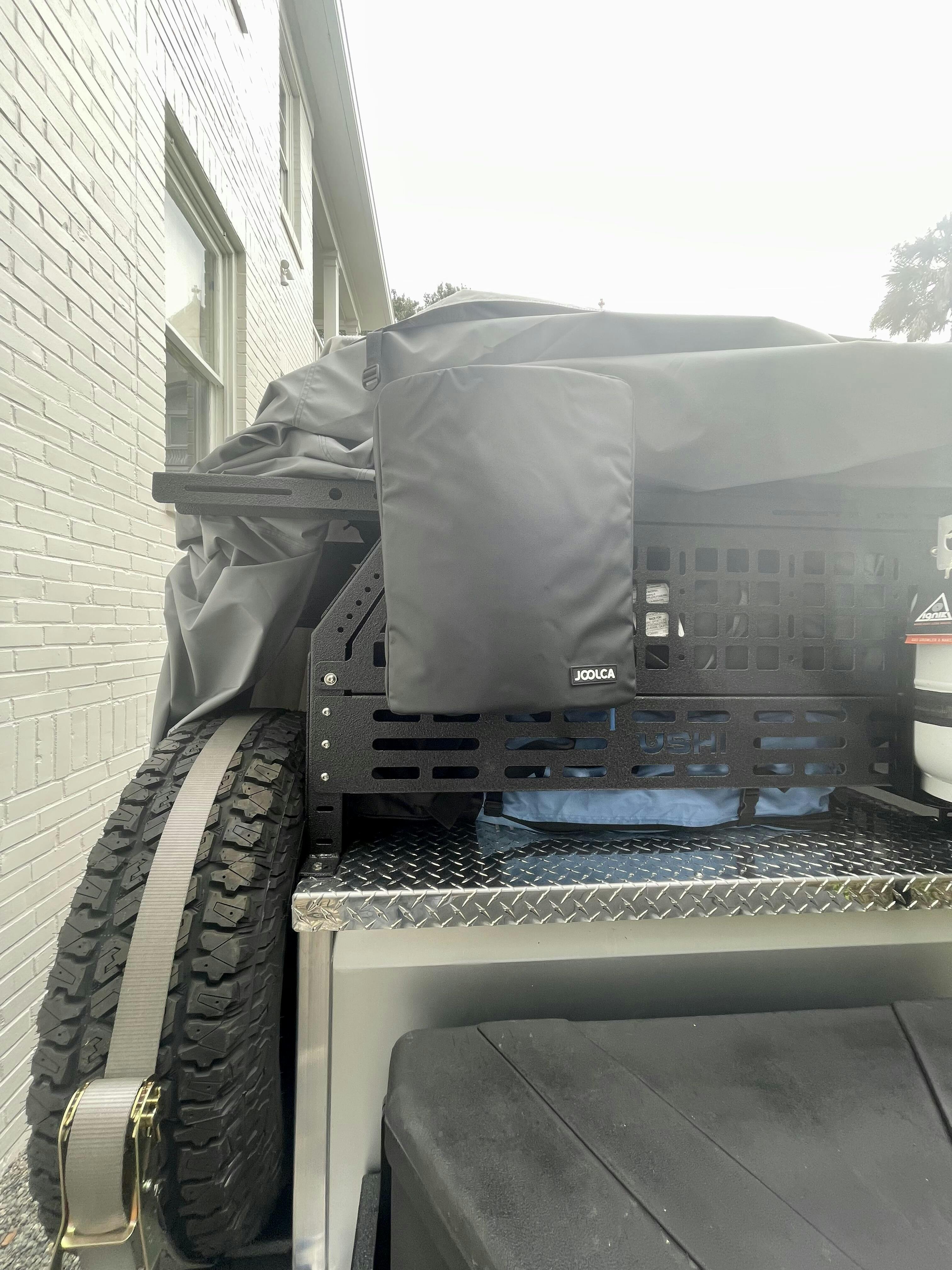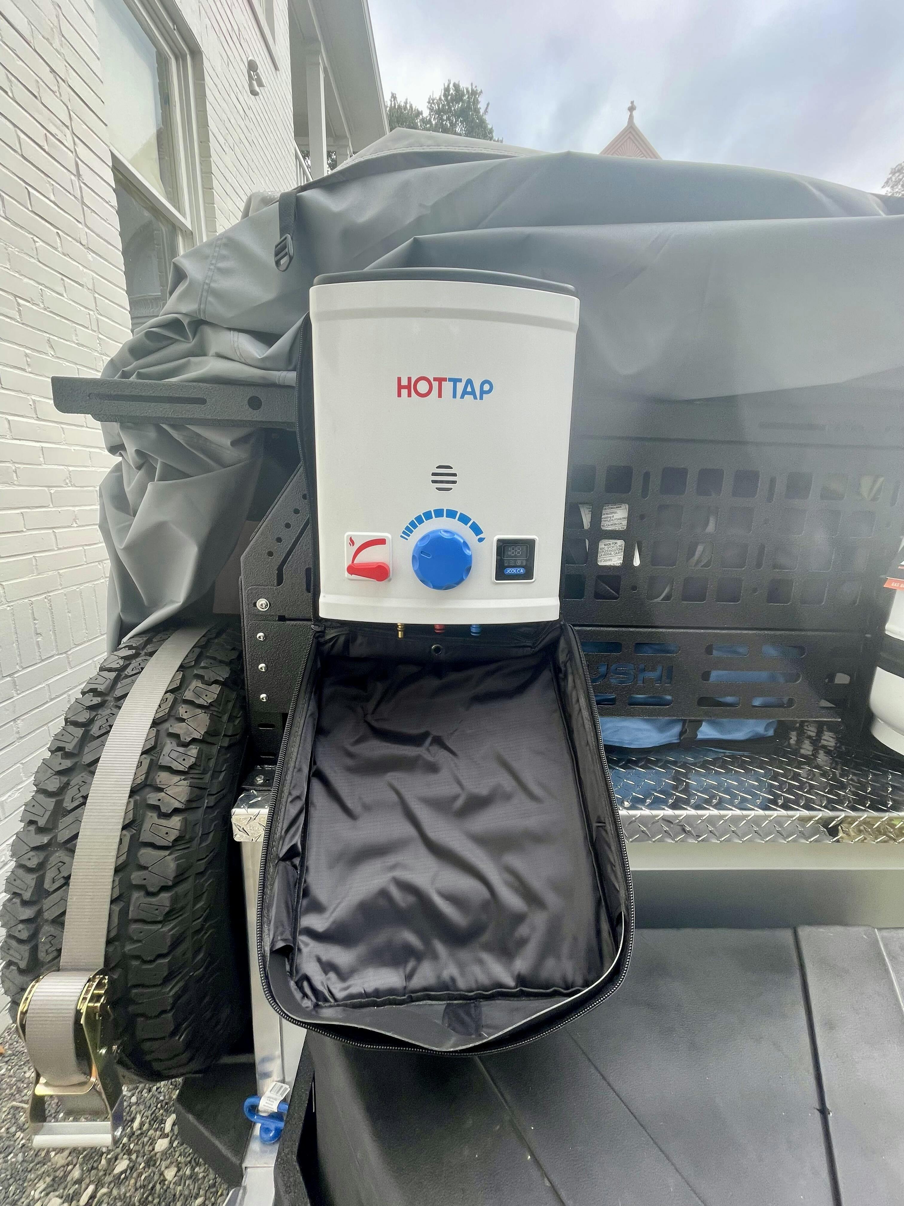 A very sturdy cover for the Hottap2. We mounted the bracket on the side of the front compartment of our Smittybilt trailer. It’s locked and loaded and ready to go!